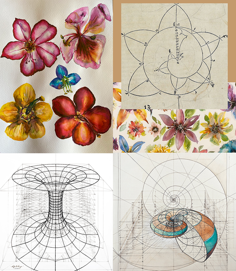 Sources: Jain108, Dan Winter, Live science, Robert Edward Grant, Britannica Encyclopaedia. Photos and images: Watercolour flowers by ArtAlkemyst, Fractal geometry by Albrecht Düerer, Star Dahlia from Chelsea Physic Garden, Rose from Kew Gardens, Rafael Araujo (Nautilus and Toroid drawings).