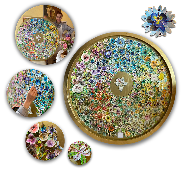 The flowers are painted in different moments and places with watercolour for its vibrant colours. The variety of shapes, individually cut out and mounted as a collage in a circular frame with a gold leaf border, make a unique piece of art.